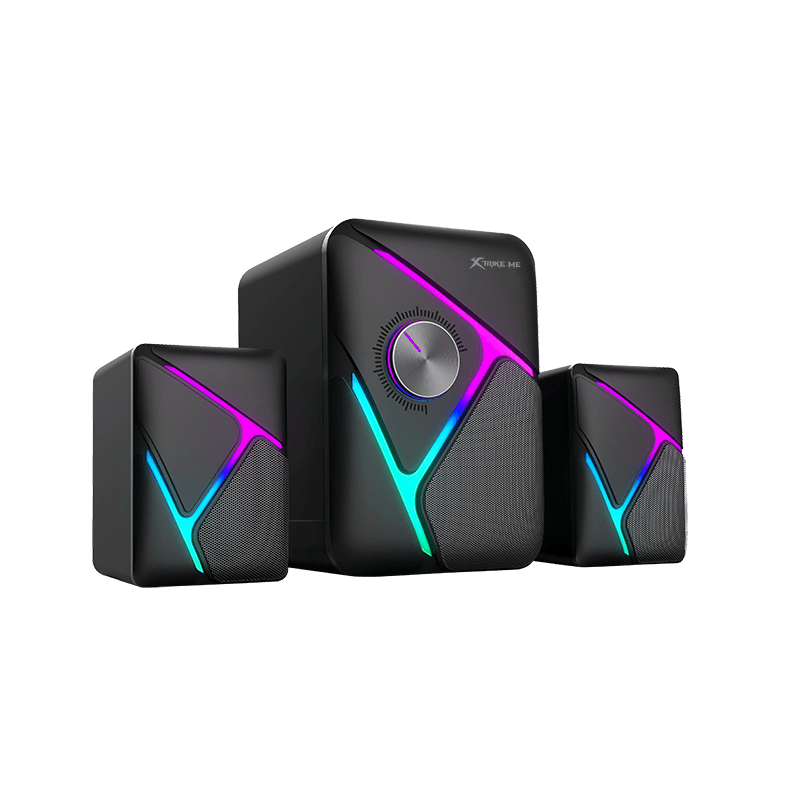 Colorful Lighting Effects: Unique symmetrical cabinet design with vibrant, multi-colored lighting effects that enhance your audio experience.